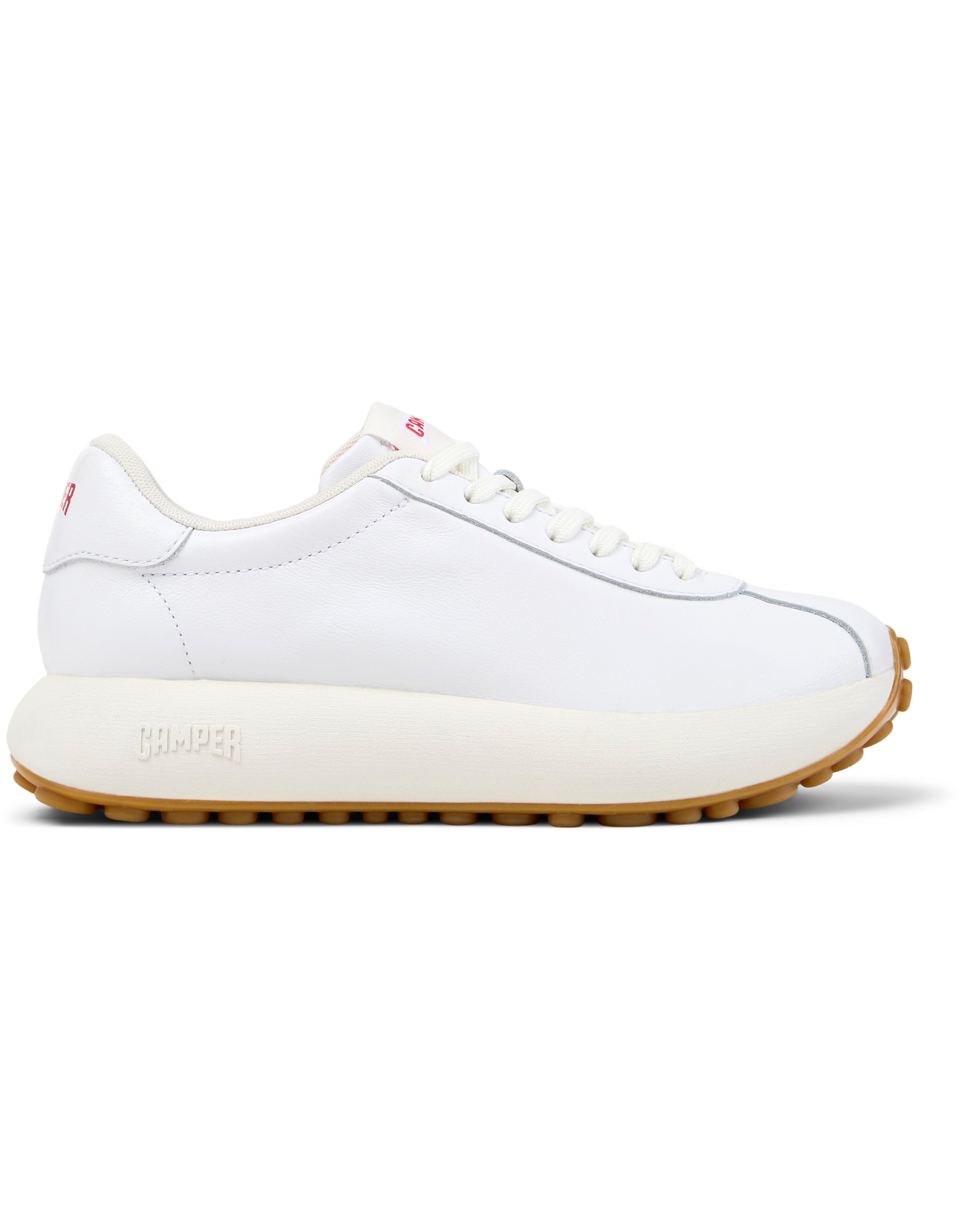 OrthoLite® Recycled™ tabanlık, EVA orta taban ve kauçuk dış tabana sahip beyaz dana derisi kadın spor ayakkabı.